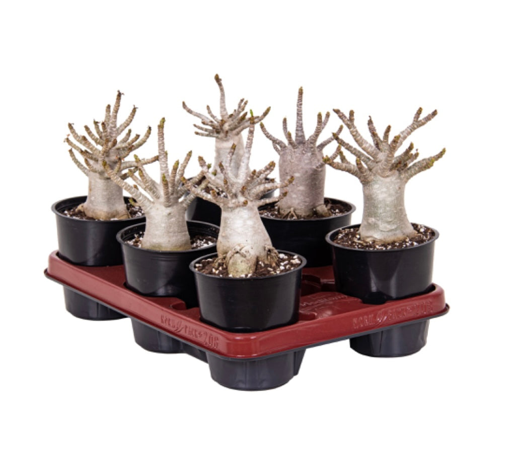 Esta planta de gran carácter atraerá la atención de todos. Rara vez vista y muy deseada por los coleccionistas, Adenium 'Ansu Baobab' parece una encantadora versión en miniatura del majestuoso Árbol Baobab. Su tallo hinchado, parecido a un vientre, sostiene ramas cortas coronadas con hojas verdes brillantes. El abultado tallo almacena agua, lo que convierte a esta planta en la elección perfecta para aquellos que tienden a olvidar regar sus plantas de interior; además, disfruta de un tratamiento similar al de una suculenta o cactus. Durante los meses de invierno, la planta entrará en un estado de reposo y perderá sus hojas, un proceso natural que dará paso a la aparición de hojas frescas en primavera. Alcanza una altura máxima de 30 cm y se extiende hasta 20 cm.