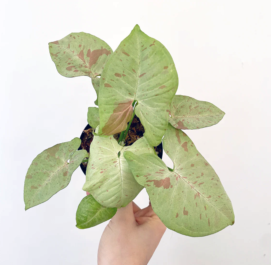 El Syngonium 'Milk Confetti' es una variedad encantadora y llamativa, famosa por sus hojas en tonos verdes suaves con salpicaduras de color rosa cremoso, como si fuera confeti. Esta planta es una adición vibrante y alegre a cualquier colección de plantas de interior, aportando un toque de frescura y dinamismo.